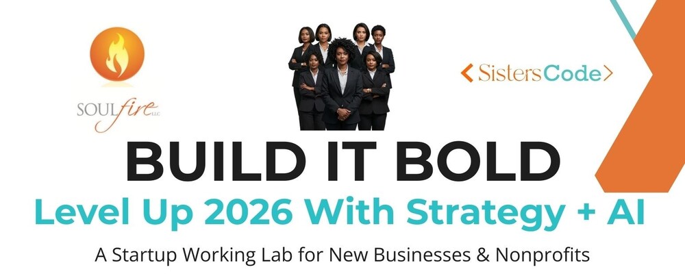 Hosted by: Soul Fire, LLC and Sisters Code, Build It Bold: Level Up 2026 with Strategy + AI is a hands-on, four-hour working lab designed for new and early-stage entrepreneurs and nonprofit founders. If you’ve been sitting on an idea, halfway through your paperwork, or unsure how to get started, this workshop is built for you.