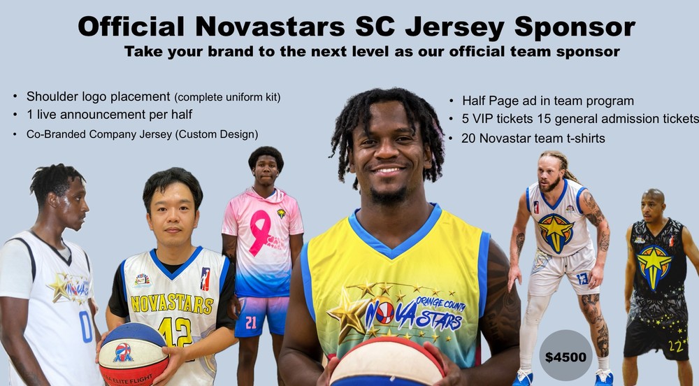 Join us for an unforgettable season of Novastars basketball with our first-ever uniform sponsorship opportunity. Elevate your brand's visibility with our high-quality uniforms and gear package, including shoulder logo placement on all uniform sets, co-branded team jerseys, and live in-game announcements. Make a lasting impact with a half-page ad in our team program and social media posts reaching over 100,000 viewers. With banner displays at the arena on game day, your brand will shine alongside our star players every step of the way. Don't miss out on this unique chance to showcase your brand in front of our dedicated fans and followers!