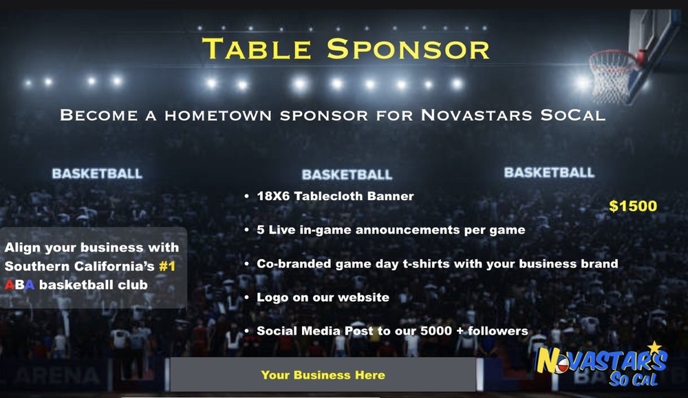 As the official sponsor, you will also enjoy the perks of having your logo prominently displayed on our website, co-branded T-Shirts for our table staff on game day, and even a commercial spot on our streaming and upcoming Roku channel. Additionally, our social media posts will reach over 100,000 viewers, giving your business the exposure it deserves. Don't miss out on this opportunity to partner with the Novastars of Southern California and become a vital part of an exciting ABA season ahead.