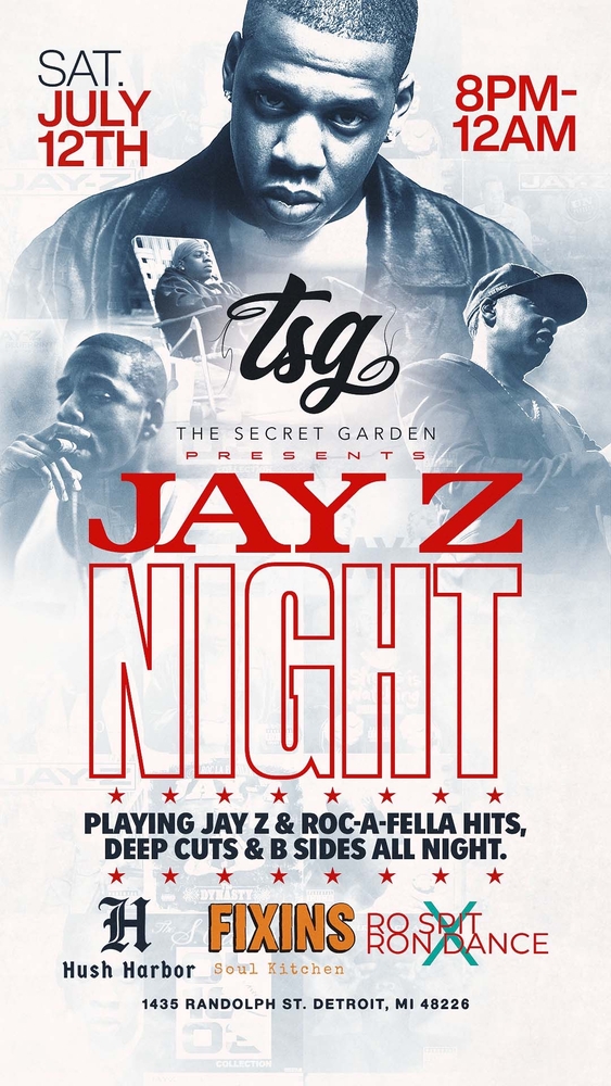 Come join us for a night filled with Jay-Z & Roca-A-Fella hits, deep cuts, and B-Sides at The Secret Garen's Jay-Z Night! Hosted at the private Speak Easy, Hush Harbor, attached to Fixins restaurant, this event is perfect for any Jay-Z & Roca-A-Fella fan or enthusiast. Sounds provided by Ro Spit and hosted by Ron Dance, this intimate event on July 12th from 8PM to 12AM will have limited capacity, so secure your tickets now before it's too late. Don't miss out on the ultimate Jay-Z experience!