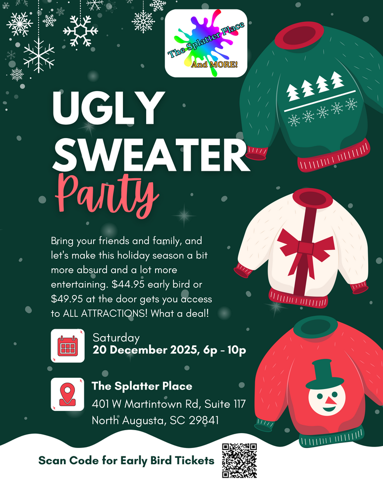 Come and experience the ultimate holiday party at The Splatter Place! Put on your ugliest sweater and get ready for an evening filled with fun, excitement, and community. Your ticket grants you access to ALL attractions, including our thrilling splatter rooms, human crane, Nerf wars, Archery Tag, and more. Let loose, mingle with fellow party-goers, and get ready to have a blast! Plus, don't forget to fuel up at our beer and snack bar to keep the party going all night long.