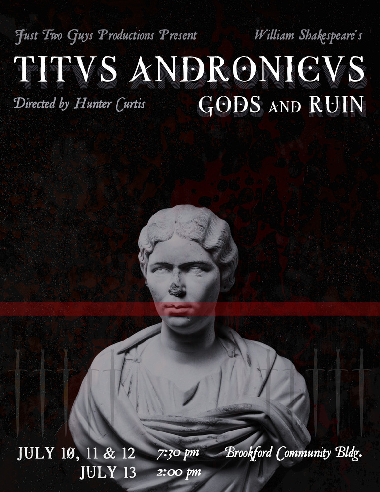 A blood-soaked production ruled by vengeance and pride, Titus Andronicus: Gods and Ruin reimagines Shakespeare's tragedy as a mythic horror tale where the ideas and inspirations of pantheons stir beneath the surface of human cruelty. As Titus returns home victorious from war, he sacrifices and enemy prince to honor his dead sons and Rome and unknowingly awakes a storm of wrath. The queen he wrongs, Tamora, seeds out and enacts her revenge through many opportunities with the assistance of her wild sons Chiron and Demetrius and her secret lover Aaron the Moor.